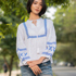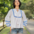 The Pure white base is delicately contrasted with vibrant white embroidery, adding a hint of bohemian charm while maintaining refined sophistication. Featuring a loose fit, long sleeves, and a tie-front neckline, the Ameliya Embroider Top flatters every silhouette and transitions seamlessly from casual brunches to graceful getaways.